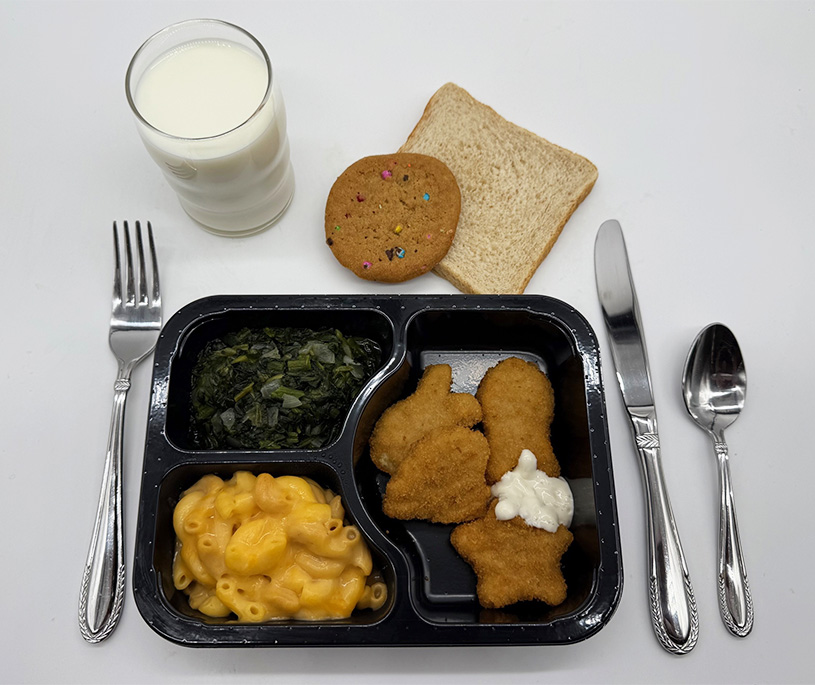 | Show Sides Buttered Rotini Pasta Italian Green Beans Texas Bread Dessert: Fresh Fruit Beverage of Choice | Show Sides Carrots and Zucchini Stewed Tomatoes Cornbread Dessert: Snickerdoodle Cookie Beverage of Choice | Show Sides Garlic Mashed Potatoes Catalina Blend Vegetables Dinner Roll Dessert: Caramel Vanilla Pudding Beverage of Choice | Show Sides Rosemary Red Potatoes Mixed Vegetables Texas Bread Dessert: Cinnamon Applesauce Beverage of Choice | Show Sides Apple Coleslaw Cucumber and Tomato Salad Multigrain Bread Dessert: Cherry Gelatin Beverage of Choice |